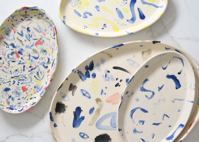 An artist collaboration featuring 43 one-of-a-kind hand-decorated platters by the painter Gordon Hull.