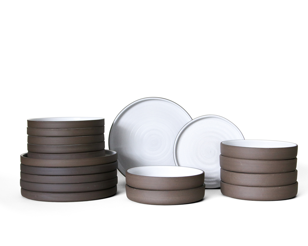 Dark Brown / White is our foundational clay and glaze combination, available in the largest assortment of shapes. With this pairing, we apply a slightly thinner coat of glaze than on our Toasted clay—enabling some of the darker clay beneath to be seen and giving the glaze an off-white tone.