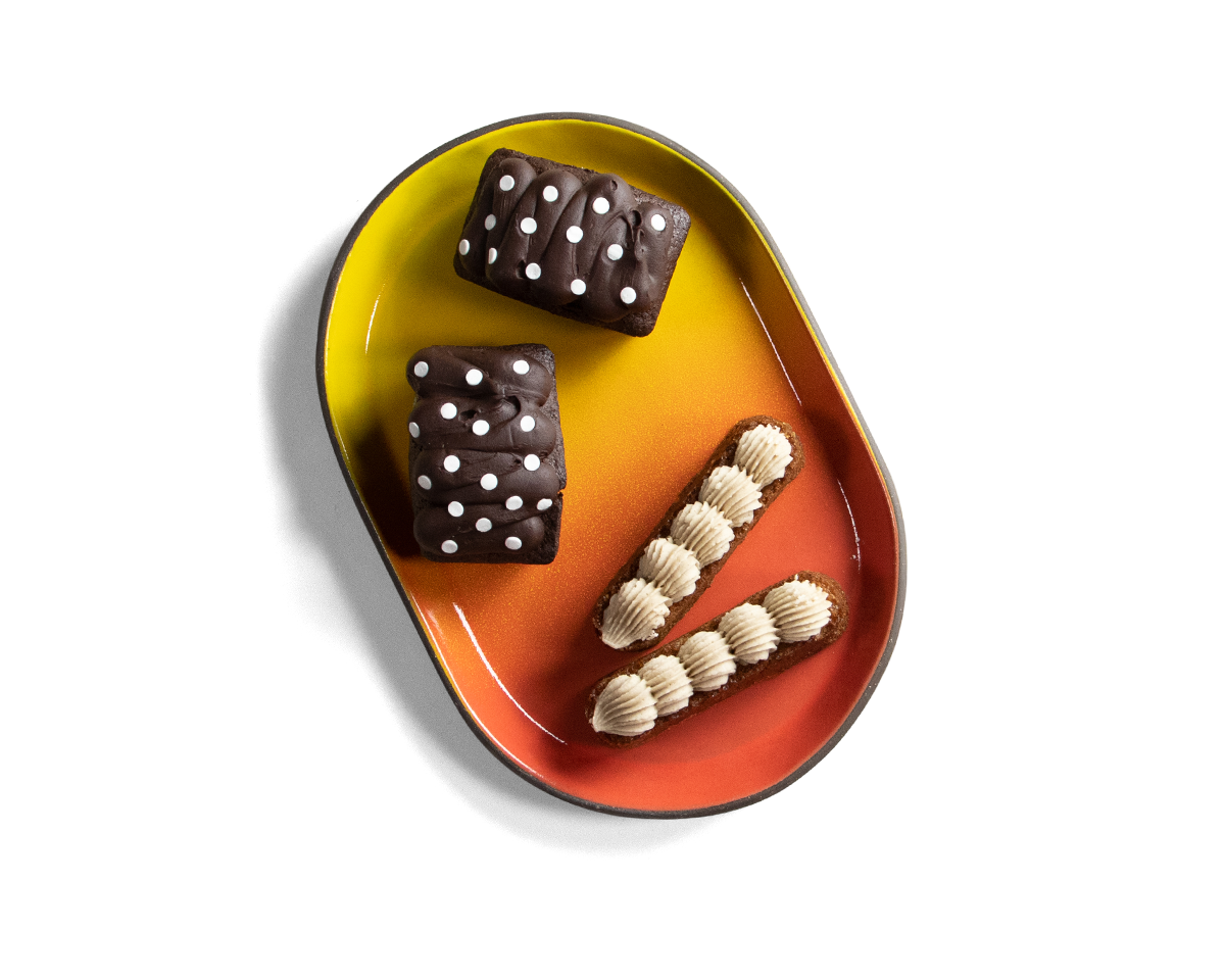 Our 2025 Holiday Gift Guide Ornament continues our annual tradition with a festive new design—a miniature Coupe Butter Plate in Dark Brown clay with a Warm Sky Blue glaze, topped with a bright yellow “slice of butter.”